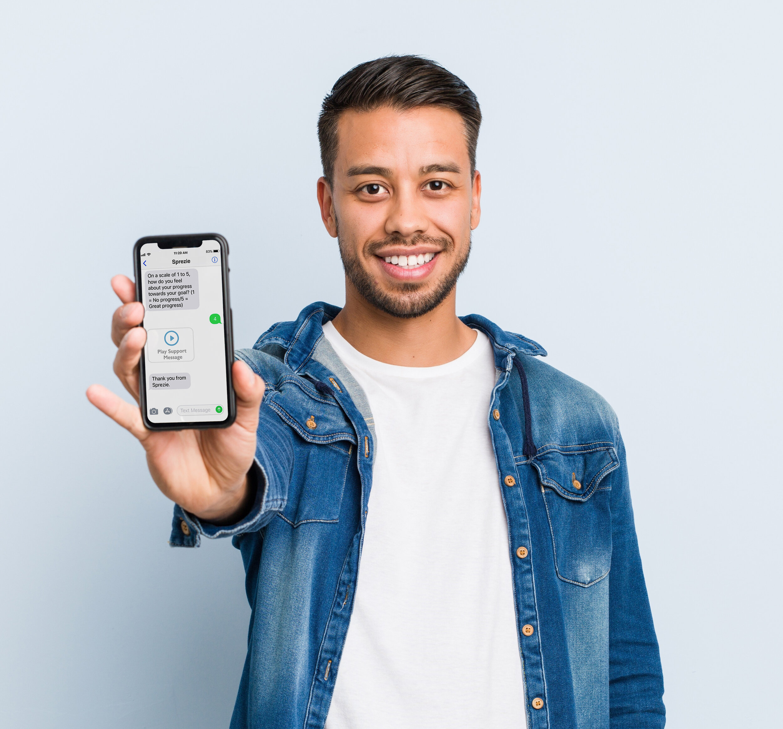 Sprezie calls or texts you on schedule, asks three questions about progress on your goal, then delivers a support message from friends and family. Each contact is less than 60 seconds. Your responses are recorded in secure online reports.
